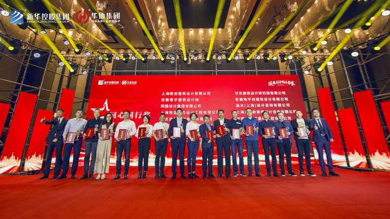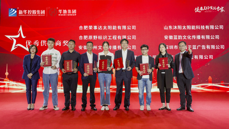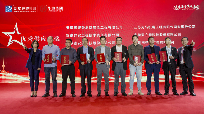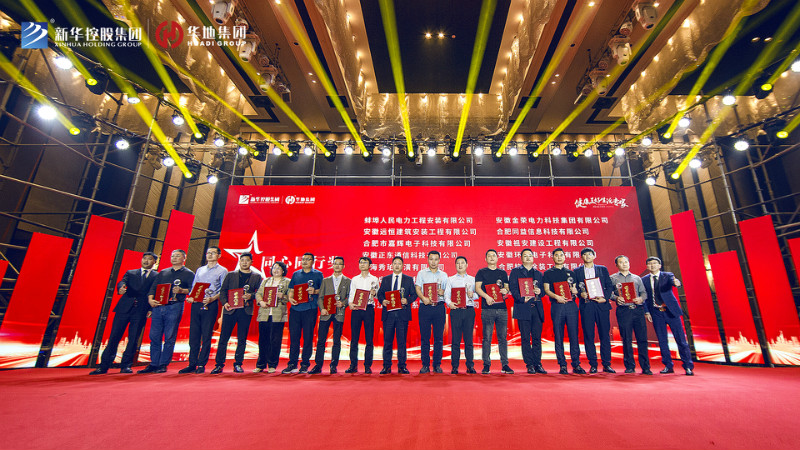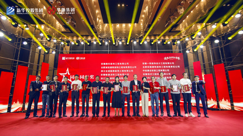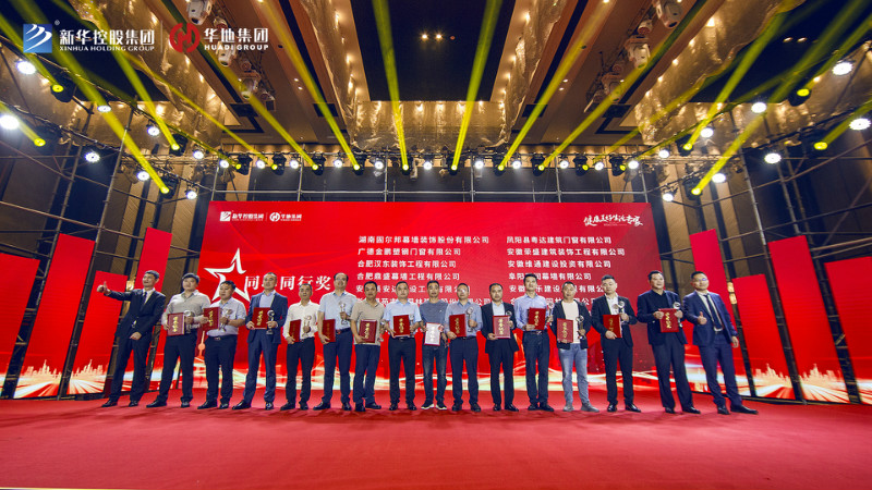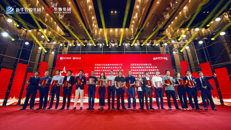 最后新華控股集團(tuán)副總裁兼華地集團(tuán)執(zhí)行總裁吳守狀先生、 新華控股集團(tuán)副總裁兼華地中安總經(jīng)理黃傳偉先生共同為標(biāo)力建設(shè)集團(tuán)有限公司、安徽省隆峰建設(shè)工程有限公司、浙江中成建工集團(tuán)有限公司、天元建設(shè)集團(tuán)有限公司、安徽省第一建筑工程有限公司頒發(fā)“年度卓越合作大獎(jiǎng)”,將本次盛典氣氛推向高潮。