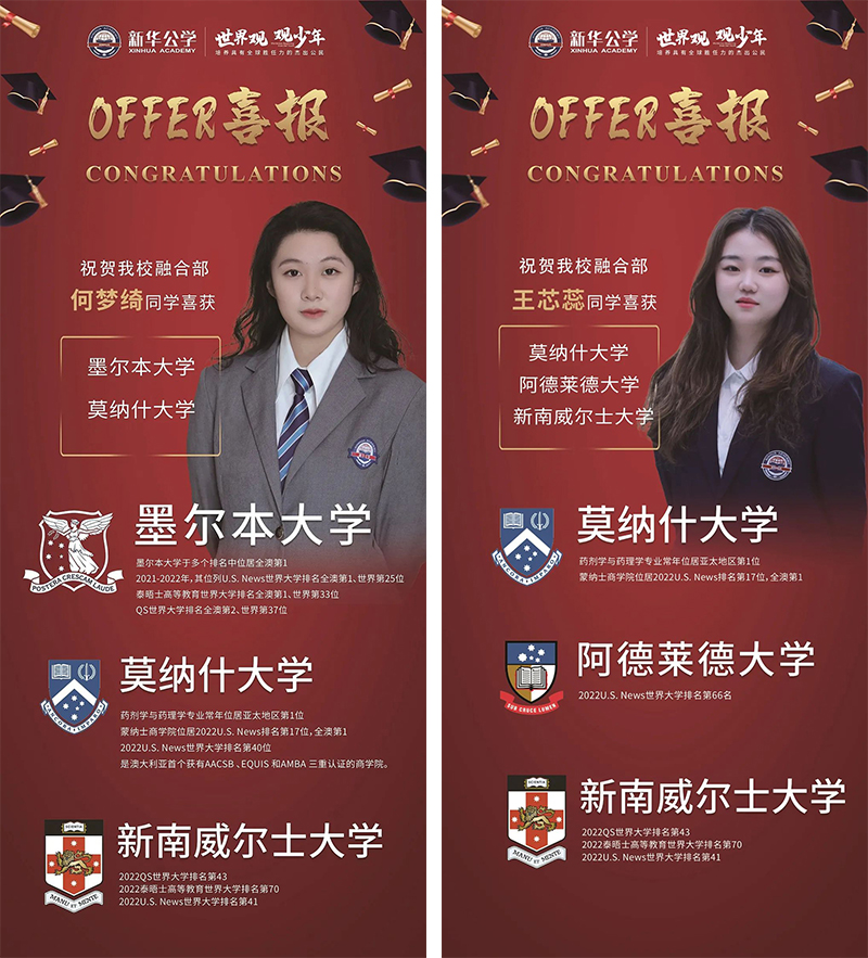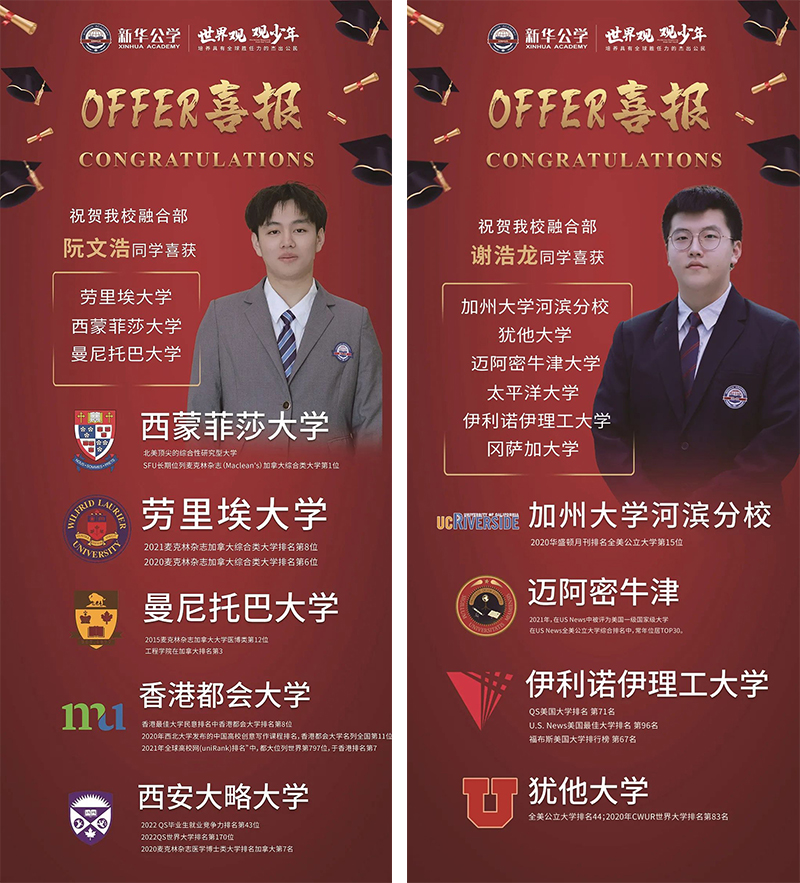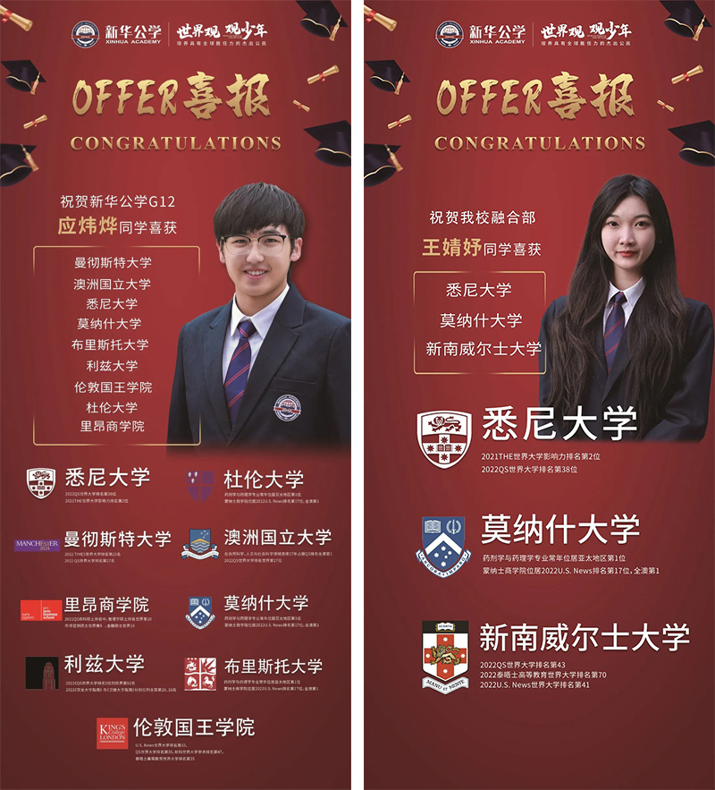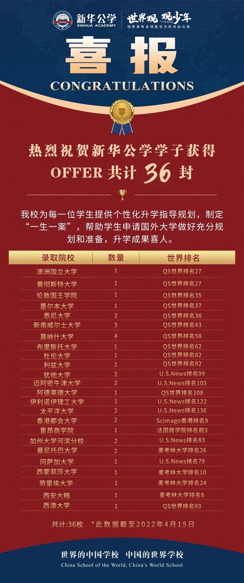 在競爭異常激烈的申請季里,新華學子表現不俗,收獲了豐碩的成果。2021-2022學年新華公學迎來首屆12年級畢業生,9名學生一共收獲36枚Offer,其中不乏世界TOP10名校。