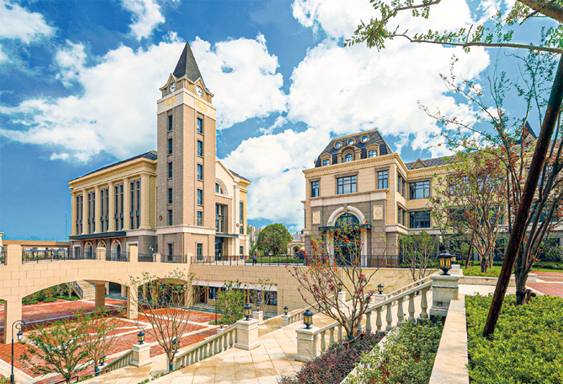 新華公學建筑風格繼承了古典主義經典美學原則,配以現代簡約的設計演繹,使得校園具有端莊雅致、成熟內斂的整體建筑風貌。圍繞建筑形成了花園式的多重院落空間,為師生打造了綠意盎然的生態景觀體系,滿足了“公共”及“獨立”的多樣化需求:軸線由入口空間展開,打造秩序感公共空間,空間類型豐富;中心核心庭院廣場,整個校區的核心亮點空間;教學區每塊設置各自的課間活動庭院;生活區設置運動場地和花園田園等休閑與生活拓展空間。