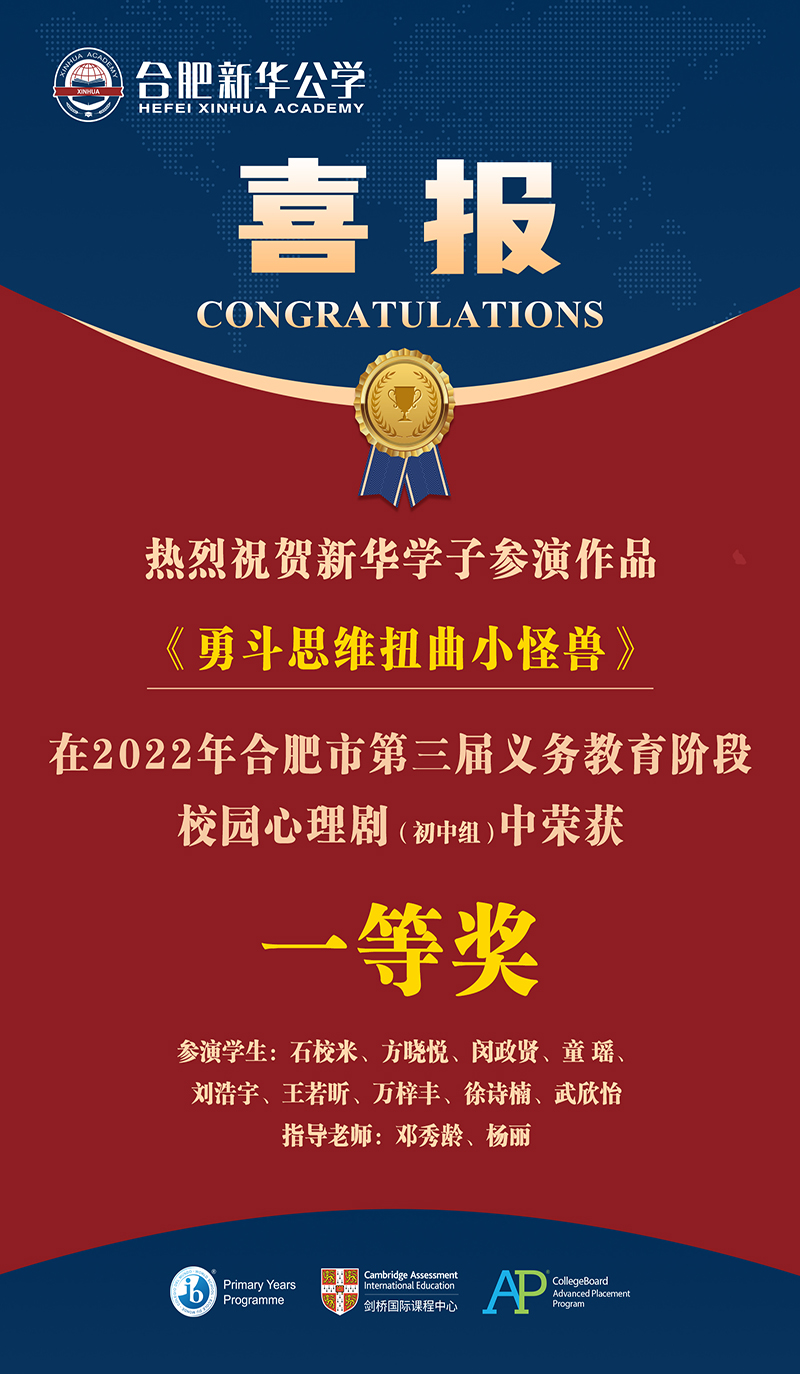 近日,“2022 年合肥市第三屆義務教育階段校園心理劇”評選活動圓滿結束,通過激烈的角逐,我校作品《勇斗思維扭曲小怪獸》榮獲初中組合肥市一等獎!