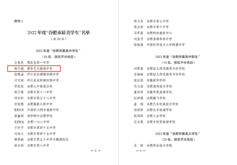 為深入學習宣傳貫徹黨的二十大精神,宣傳貫徹習近平新時代中國特色社會主義思想,大力弘揚優秀學生的先進事跡,充分發揮榜樣的作用,近日,由合肥市教育局、共青團合肥市委員會、合肥市學生聯合會聯合開展的2022 年度“合肥市最美學生” 暨第十屆“合肥市十佳學生” 評選結果出爐。我校高二(1)班郁子超同學獲評“合肥市最美中學生”稱號!