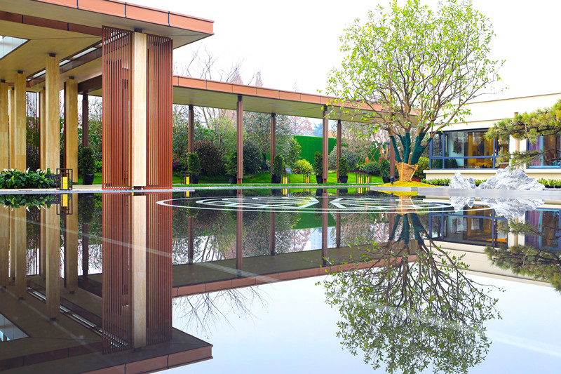 入戶處,緩緩流動的水池如娟娟細(xì)流、栩栩如生的雕塑如麋鹿漫步、青蔥翠綠的灌木如山間野花,閉上眼,仿佛踏入了原始森林,神秘而寧靜。