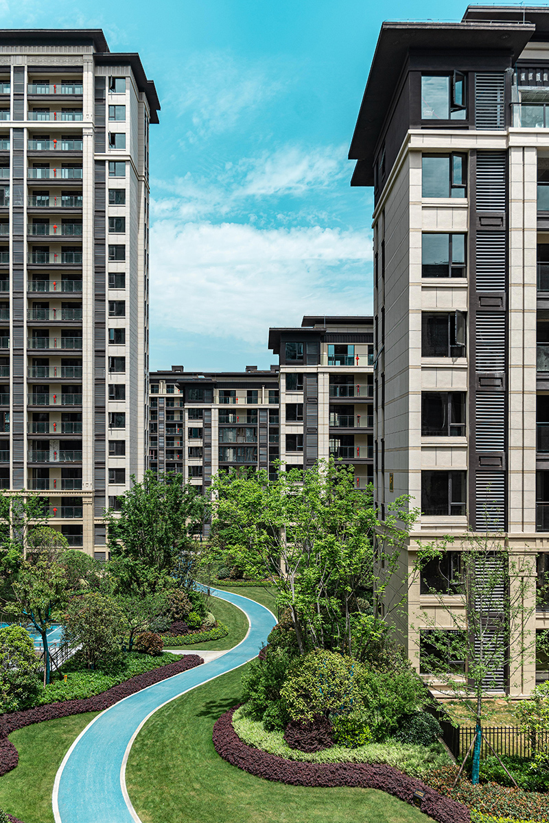 華地堅持以境造園,繪就詩意人生。景觀中軸由北至南,一脈貫穿,中軸線上匯聚多種珍貴樹種,呈四季斑斕,花香滿徑,樹影錯落,猶如一幅展開的畫卷,人于畫中游。
