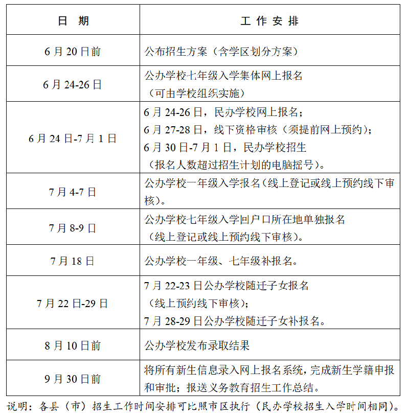 1. 招生時(shí)間。公辦學(xué)校招生時(shí)間從6月下旬開(kāi)始,市區(qū)時(shí)間安排見(jiàn)下圖,具體時(shí)間由各縣(市)、區(qū)教育主管部門安排。