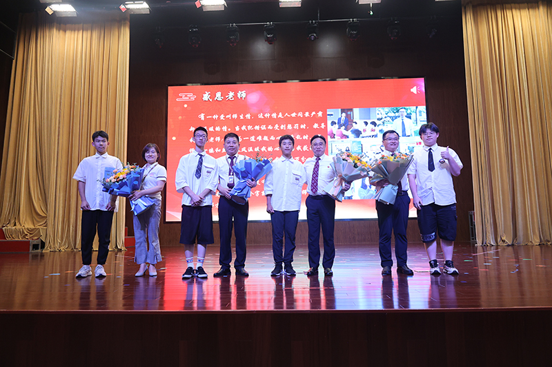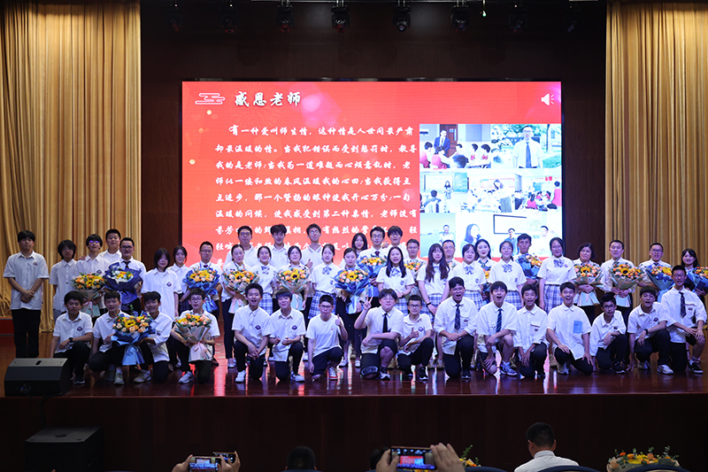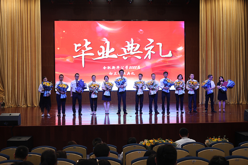 終章散場(chǎng),學(xué)生依次上臺(tái)為敬愛(ài)的老師們送上鮮花,全體初三老師獻(xiàn)唱《放心去飛》。“放心去飛,勇敢地?fù)]別,這一次說(shuō)好了不掉眼淚”,我們緊緊相擁,我們微笑話別,祝福彼此,愿少年此去前程似錦,歸來(lái)功成名遂!