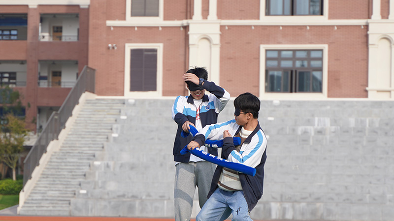 蒙住雙眼,靠聽覺去發(fā)現(xiàn)對方位置,模仿俠客用長條氣球刺敲打?qū)Ψ剑惨⒁夥直嫱饨绺蓴_,歡聲笑語在操場飄蕩,幫助同學(xué)們釋放學(xué)習(xí)壓力。