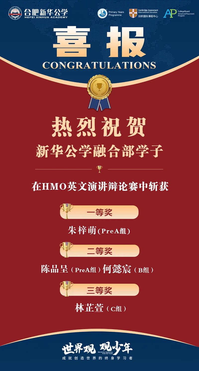 新華公學始終以打造“高品質名?!睘槟繕?,在各個領域不斷開創新局面,塑造“名師”、打磨“名課”、培養“名生”。在剛剛過去的第三屆"Hear Me Out" 英文公益演講辯論賽中,我校融合部學子在王佳曦老師的指導下取得優異成績,展現了不俗的風采!