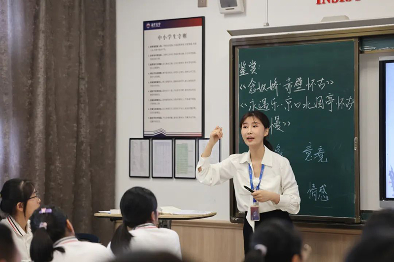 第一節課,胡老師執教的是《念奴嬌 赤壁懷古》《聲聲慢》。胡老師由拍攝文學紀錄片導入,然后引導學生從意象、意境、情感等方面賞析詩歌,感受兩首詩歌的不同風格。