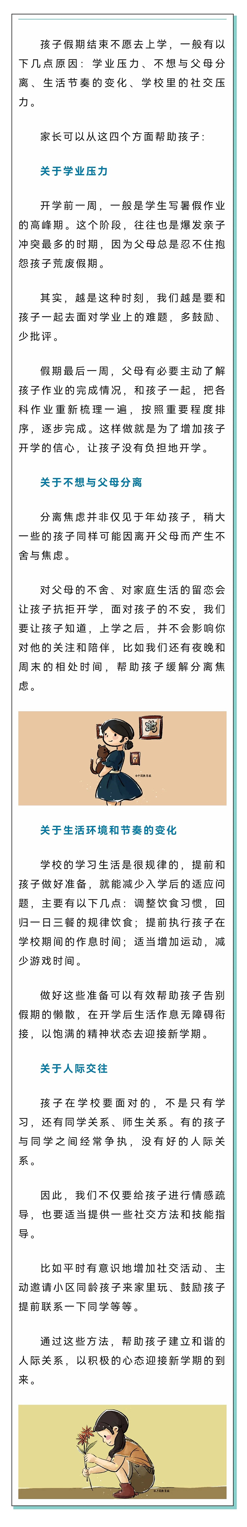 家長要嘗試去讀懂并理解孩子的情緒,幫助孩子分析原因,多鼓勵,多溝通。最重要的,是給予孩子積極的心理暗示。比如可以引導孩子回憶校園發生的趣事,喚醒孩子對老師同學、校園生活的想念,讓孩子重新燃起對學校生活的憧憬,從心理上對新學期充滿期待和信心。